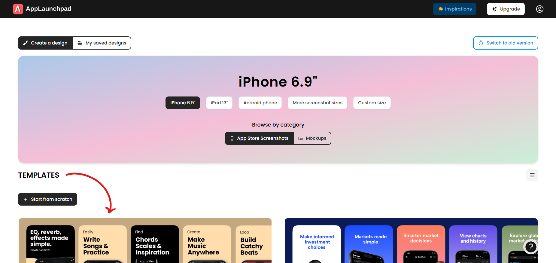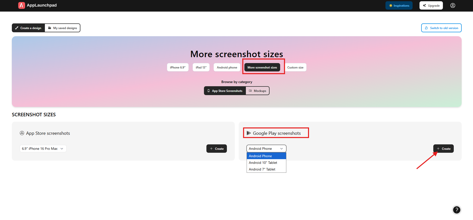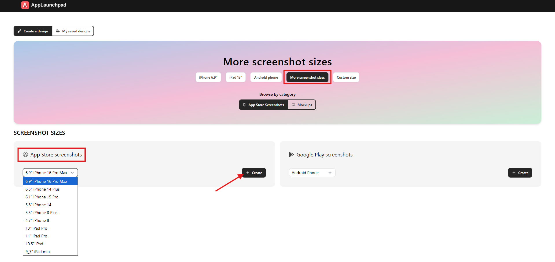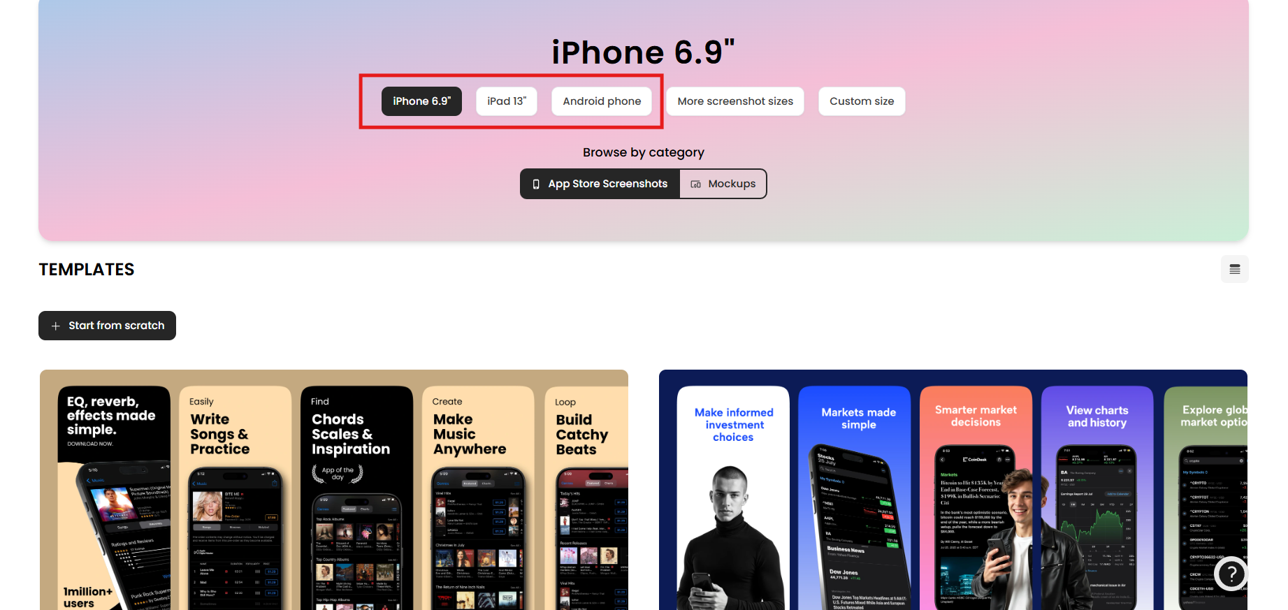1. Choose a device type from **iPhone 6.9**, **iPad 13**, or **Android** phone.